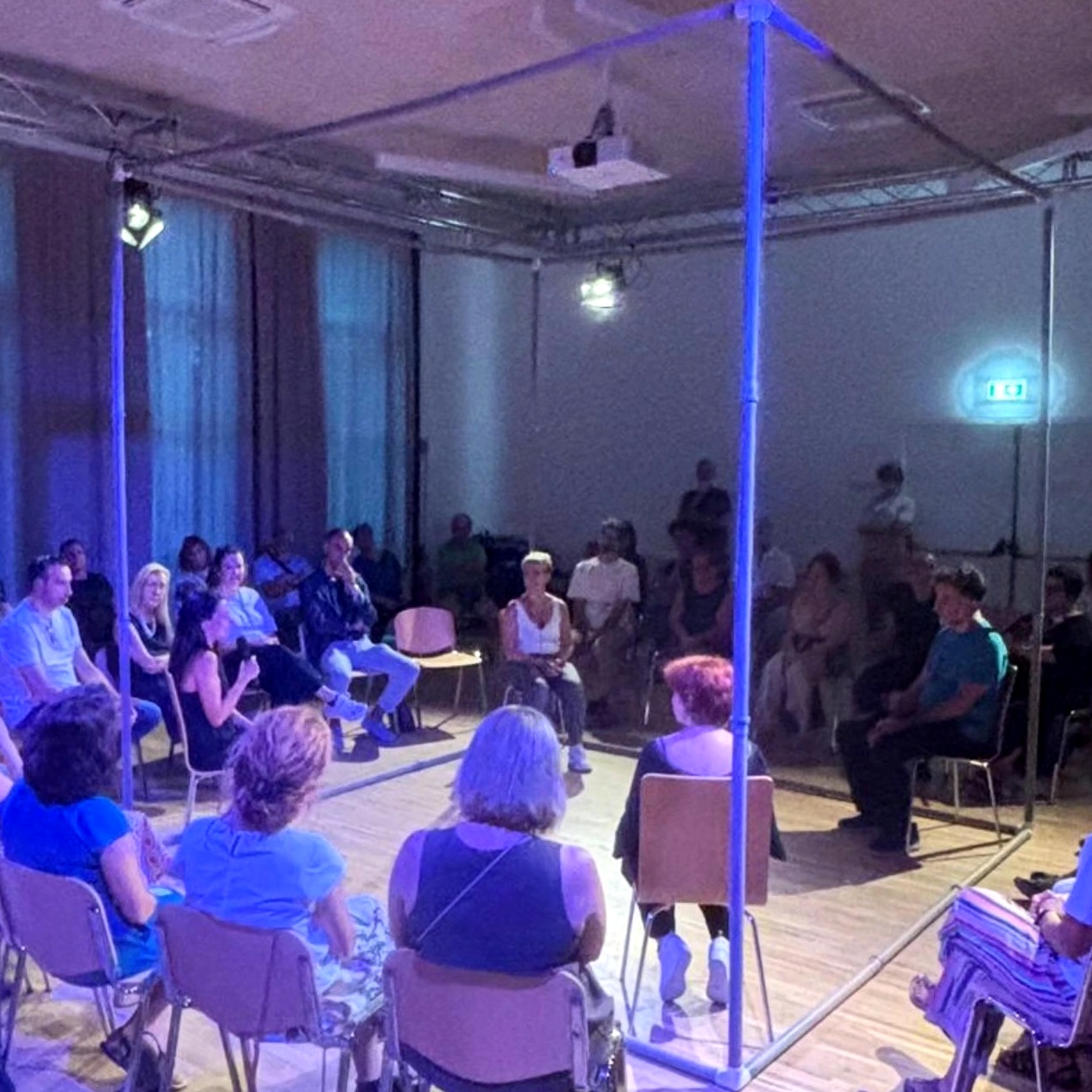 Per tutti, artisti, narratori, spettatori, l’esperienza accade nel momento presente, senza una precedente preparazione. Ulteriore pubblico può osservare l’esperienza fuori dal cerchio degli spettatori seduti. Con questa esperienza si vuole stimolare la scoperta del potere di creazione e trasformazione collettiva. Attori e spettatori non sono più separati, ma collaborano, all’interno dello stesso spazio condiviso.